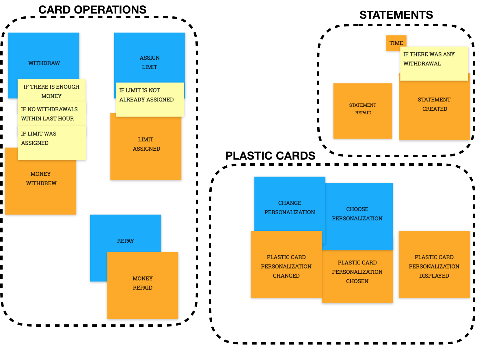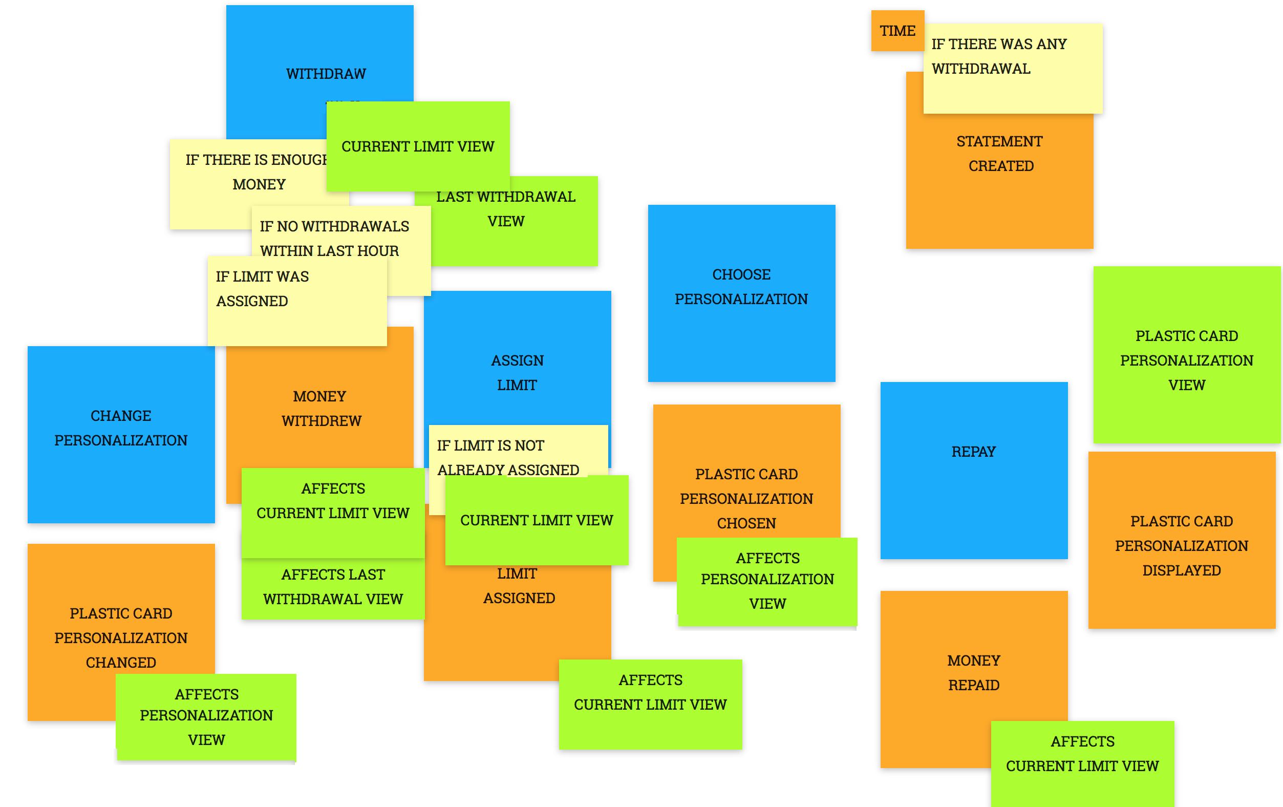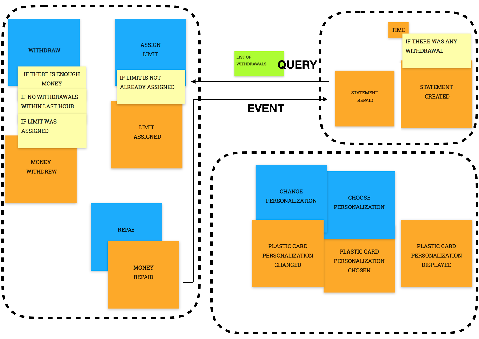 In order to check invariants (yellow notes) system must ask some questions. For instance, in order to withdraw there must be already an assigned limit. System must run a query: “Hi, does it have assigned limit?”. On the other hand, there are commands and events that might change answer to that question. For instance, the first command to assign limit changes that answer from no to yes forever. This a clear indicator of highly cohesive behaviors that might go together into one module or class.